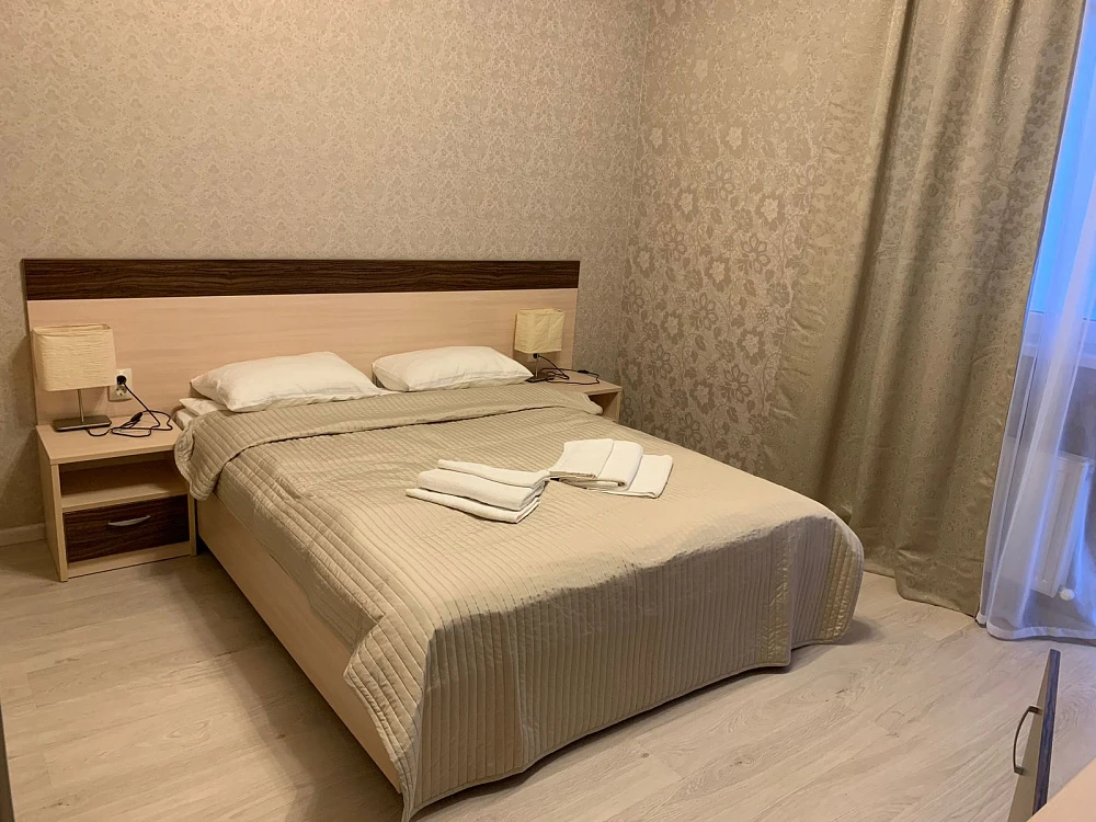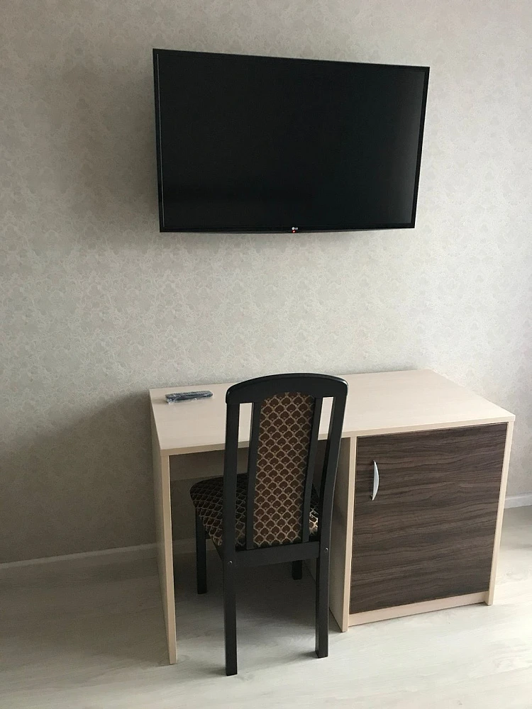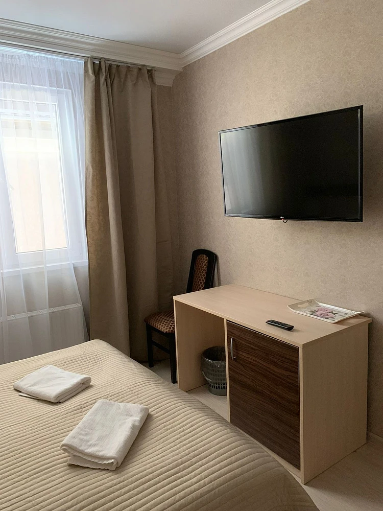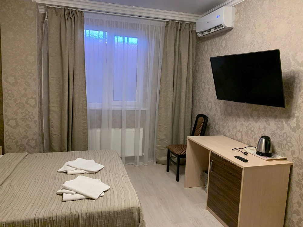 Номера: УДОБСТВА В НОМЕРЕ "Стандарт": 2-местные номера с современным ремонтом. В номерах: спальный гарнитур, двуспальная кровать или 2 раздельные кровати, стол, стулья, шкаф для одежды, зеркало, мини-холодильник, телевизор, кондиционер, чайник, фен, санузел с душем, туалетом, раковиной, набор полотенец для каждого гостя.