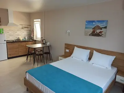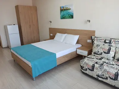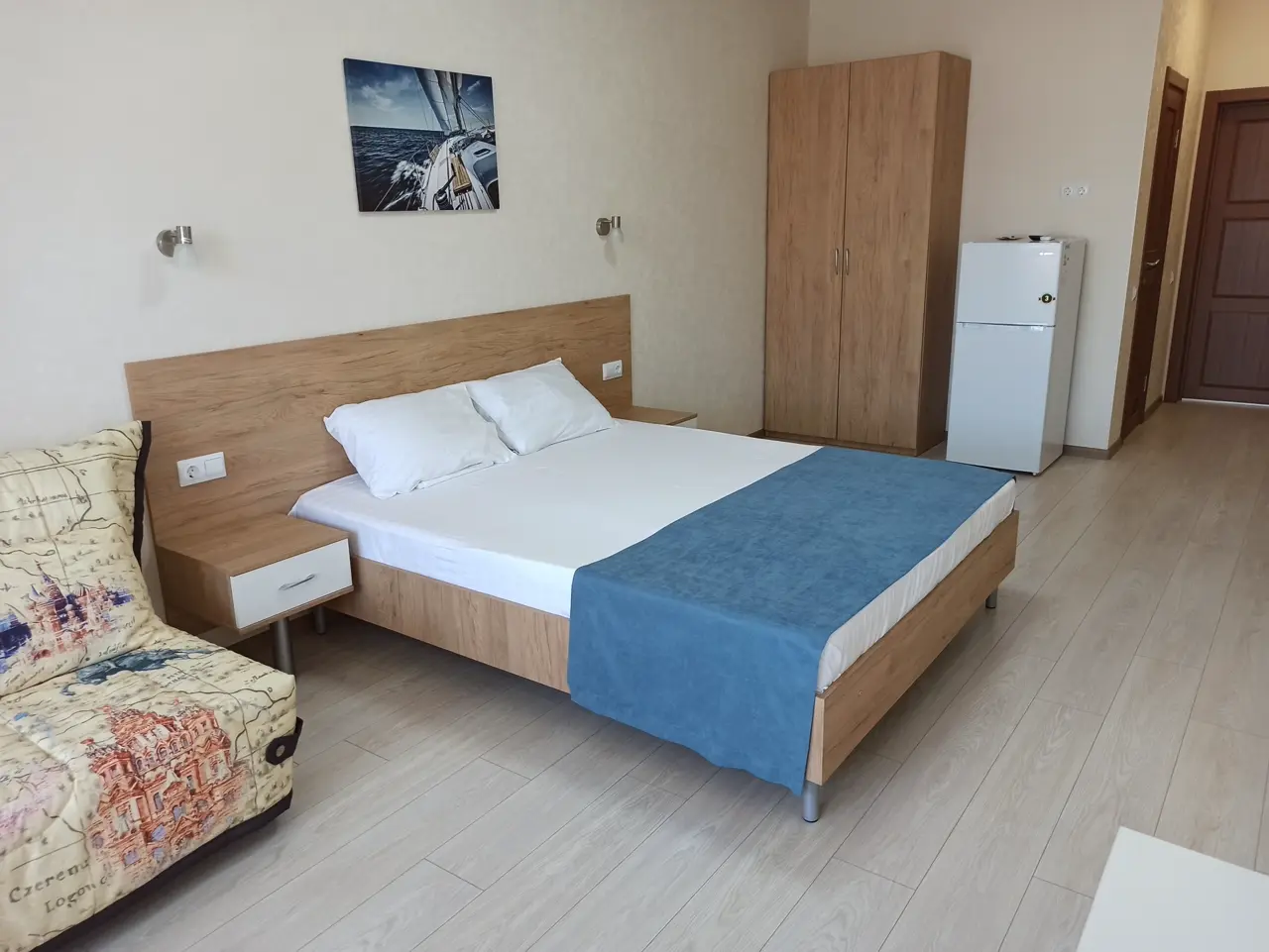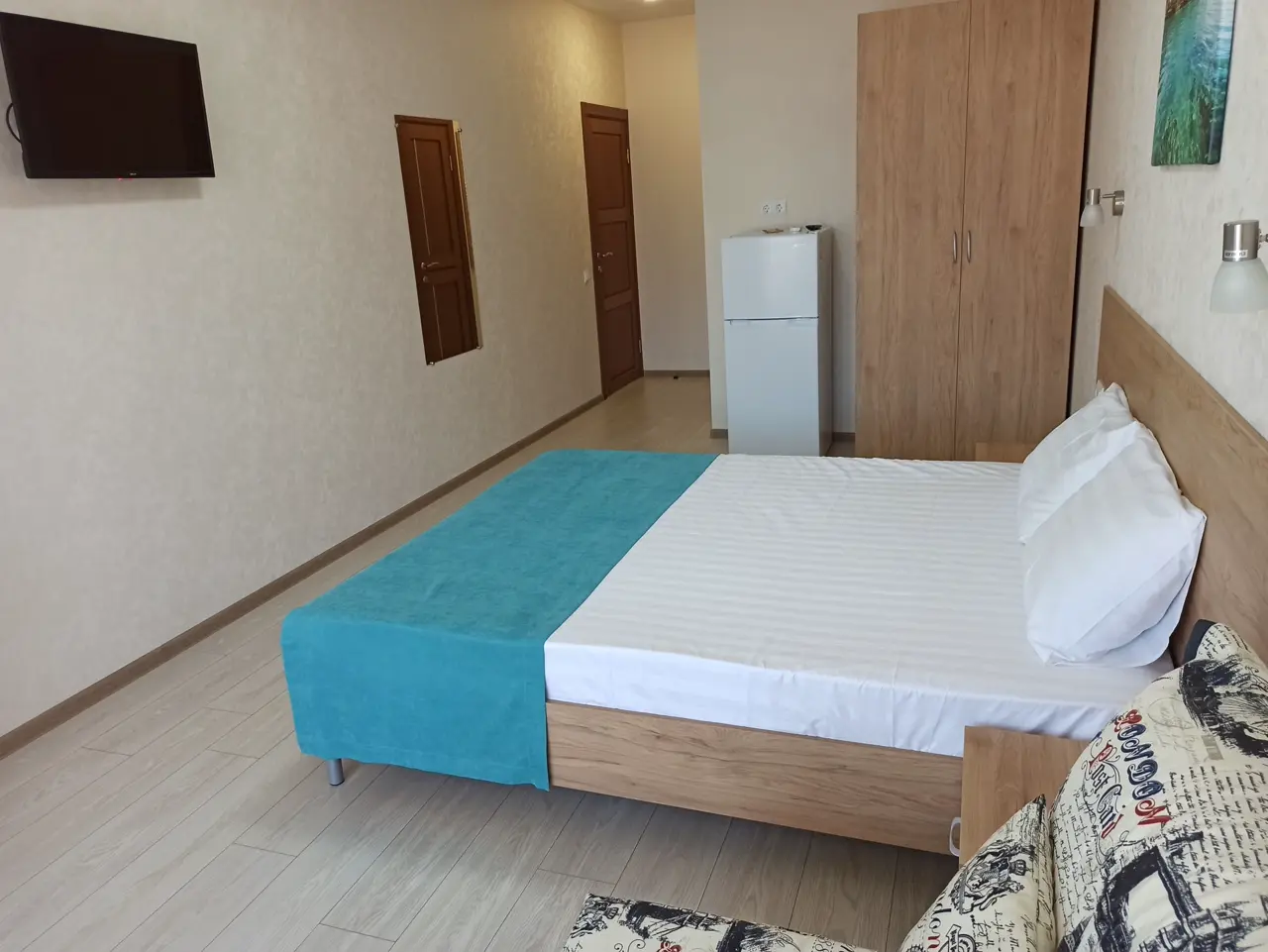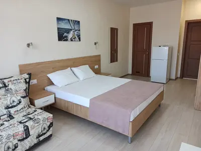 В номере: двуспальная кровать, холодильник, светильник, микроволновая печь, кондиционер, санузел+душ, банные полотенце, стул, зеркало, мебельный гарнитур, стол, вешалки, журнальный столик,мягкая мебель. шкаф для одежды, кухонный уголок. стаканы, столовые приборы, Wi-Fi.