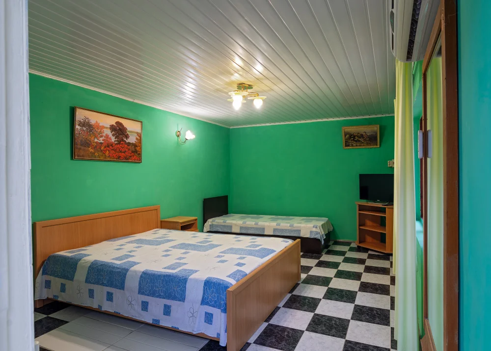 Каждый номер имеет собственную беседку перед входом в номер. В каждом номере свой выход во двор. В комнате: ТВ , кондиционер. Во дворе рядом с каждым номером свой индивидуальный санузел с душем, туалетом и бойлером для нагрева воды. Общая кухня только для этих 3-х номеров. Где установлен для каждого номера индивидуальный холодильник.