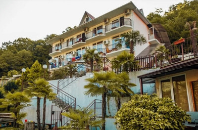 Расположение: расположен в живописном и тихом районе курортного поселка Лазаревское, вдали от шумных ночных заведений и федеральной трассы. Благоустроенный мелко-галечный пляж «Дельфин» находится в 7 минутах спокойной ходьбы. На пляже работают многочисленные кафе, бары, различные аттракционы как для детей, так и для взрослых, пункт проката пляжного инвентаря и прочее. По пути к пляжу работают 2 кафе-столовые - "Минутка" и "Василёк". В нескольких минутах ходьбы находятся остановка общественного транспорта, бильярдная, продуктовый магазин, аптека. Аквапарк и дельфинарий расположены в 500 метрах от отеля.