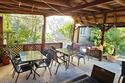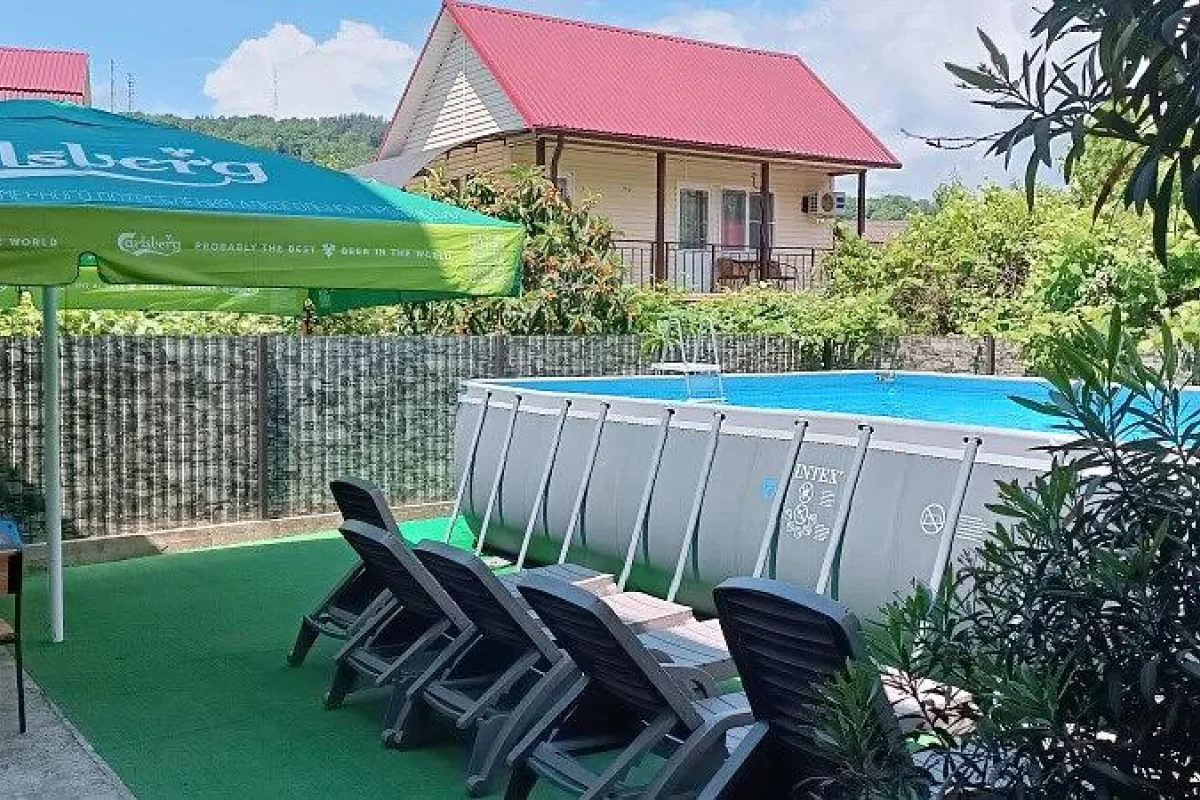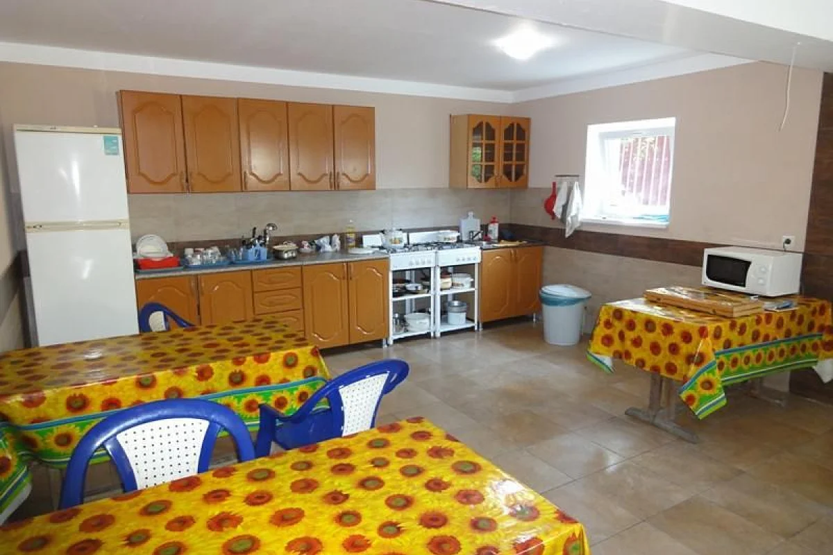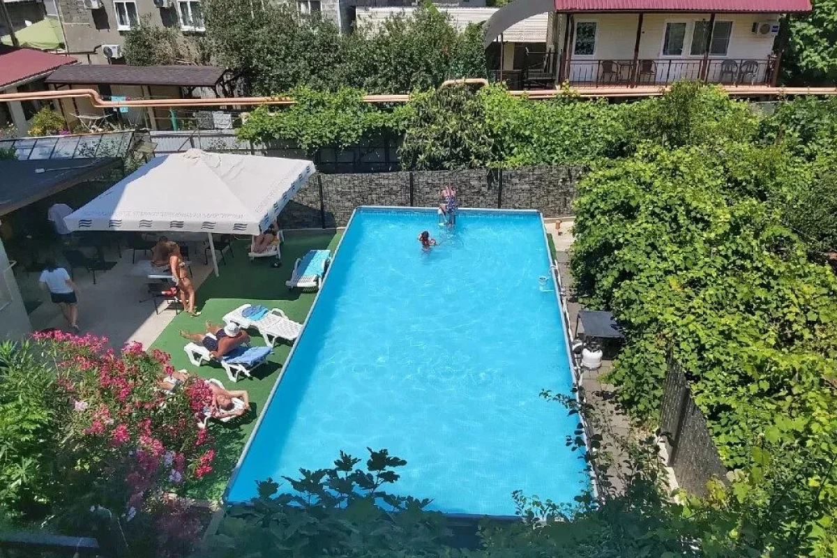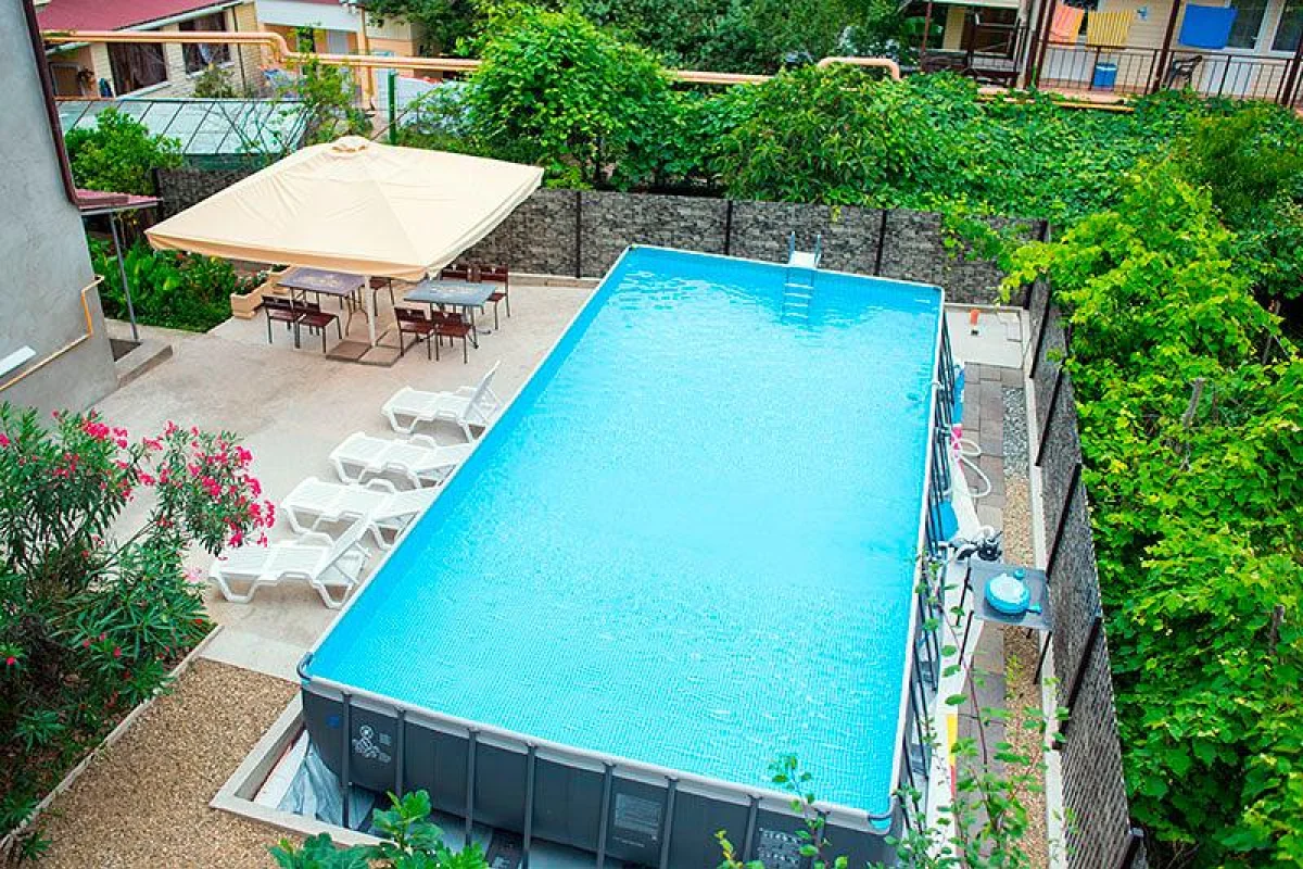 Территория дома облагорожена и озеленена. Имеется кухня со всем необходимым для самостоятельного приготовления пищи. Большой бассейн и лежаки, зона отдыха с беседкой. Мангальная зона. Стоянка на 12 машин (бесплатно). На территории гостевого дома бесплатная зона Wi-fi.