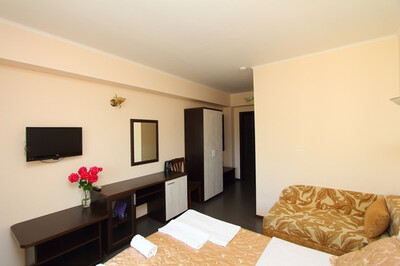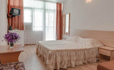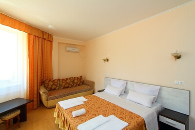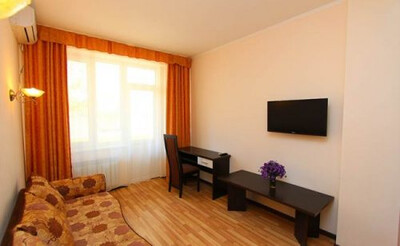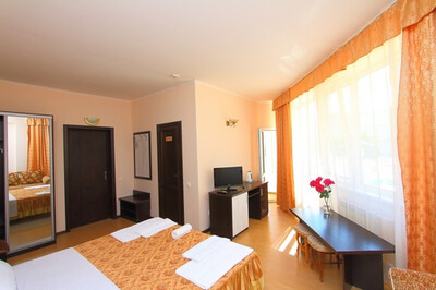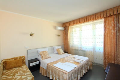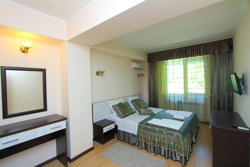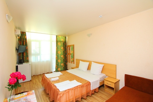 В номере: санузел и душ , двух-спальная кровать или две одно-спальные кровати, диван-кровать, стол, стулья, шкаф, журнальный столик, прикроватные тумбочки, вешалка, зеркало, холодильник, жк-телевизор, сплит-система, электрический чайник, посуда, сушка для белья.
