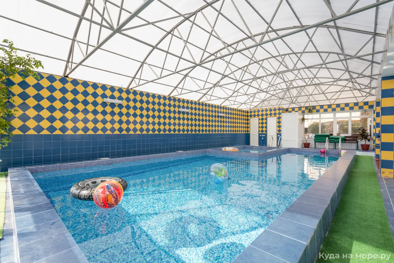 Инфраструктура: Wi-Fi, крытый бассейн с подогревом (12*5,5), зона отдыха на свежем воздухе около бассейна, детская площадка, качели, тренажеры на открытом воздухе, есть своя выделенная часть на пляже с шезлонгами и зонтами, парковка, зона барбекю. Для детей проводится анимация 2 раза в неделю. Есть собственная столовая (питание за доп плату на месте), кухни для самостоятельного приготовления пищи нет.