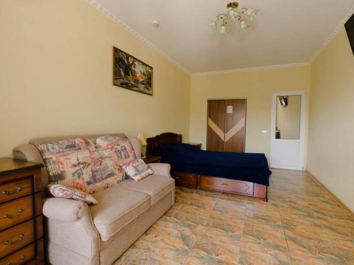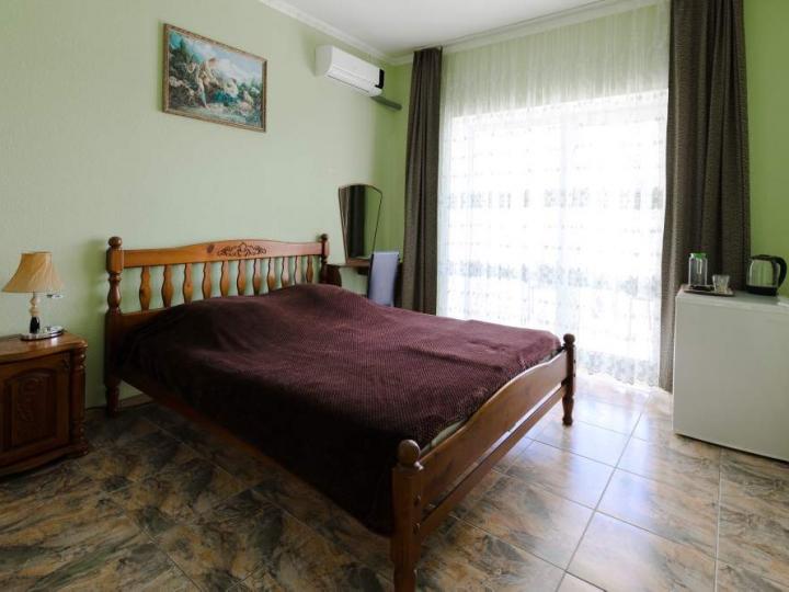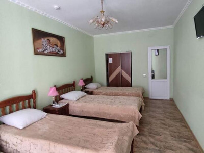 - 3-местные семейные номера. Расположены на первом этаже. В номерах: телевизор, кондиционер, санузел, холодильник, Wi-Fi, двуспальная кровать и диван.