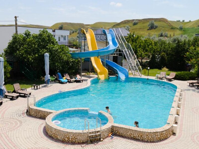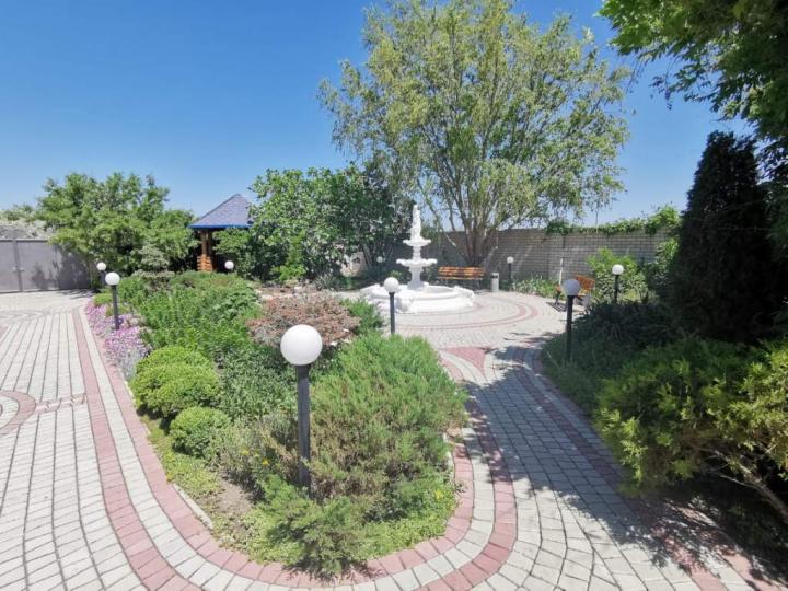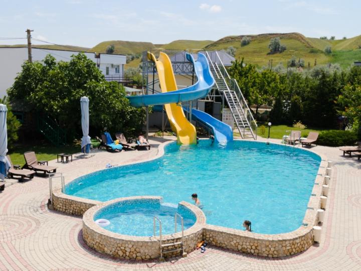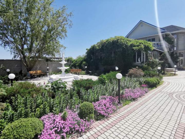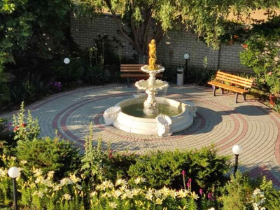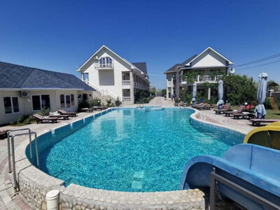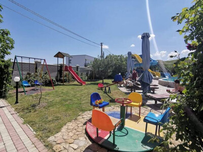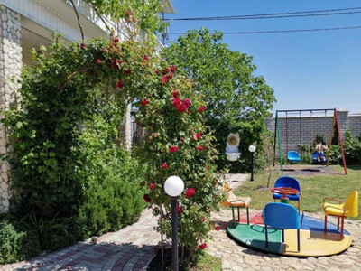 Инфраструктура. У гостевого дома большая территория, окруженная зелеными газонами, клумбами цветов, фонтаном и летней площадкой. Для отдыхающих есть: бассейн с двумя водными горками, столовая, кафе, детская комната, детская площадка, настольный теннис, бильярд.